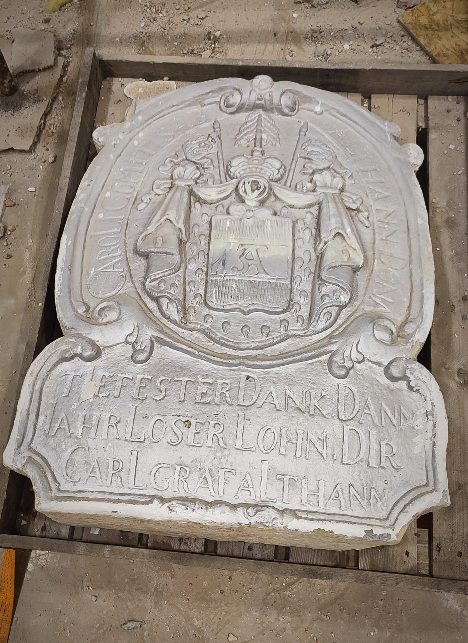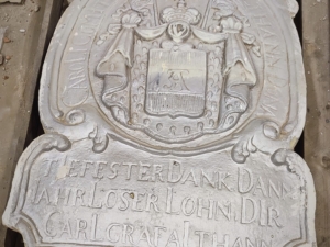 V historické budově, kde sídlí Muzeum K-S 14 „U cihelny“ s oběma svými památníky, se v bývalé tělocvičně v podzemí, skrytý očím veřejnosti, nacházel tento pamětní kámen, připomínající činy a historii šlechtického rodu Althannů. Ani jemu se nevyhnul zub času a v několika stoletích se na něm značně podepsal. Pamětní kámen byl pokryt desítkami vrstev zcela nevhodných barev a ve finále v roce 1974 bylo přímo přes hlavní erb rodu Althannů nataženo vedení ústředního topení s izolací, které jej na dlouhých 50 let zcela zastínilo.